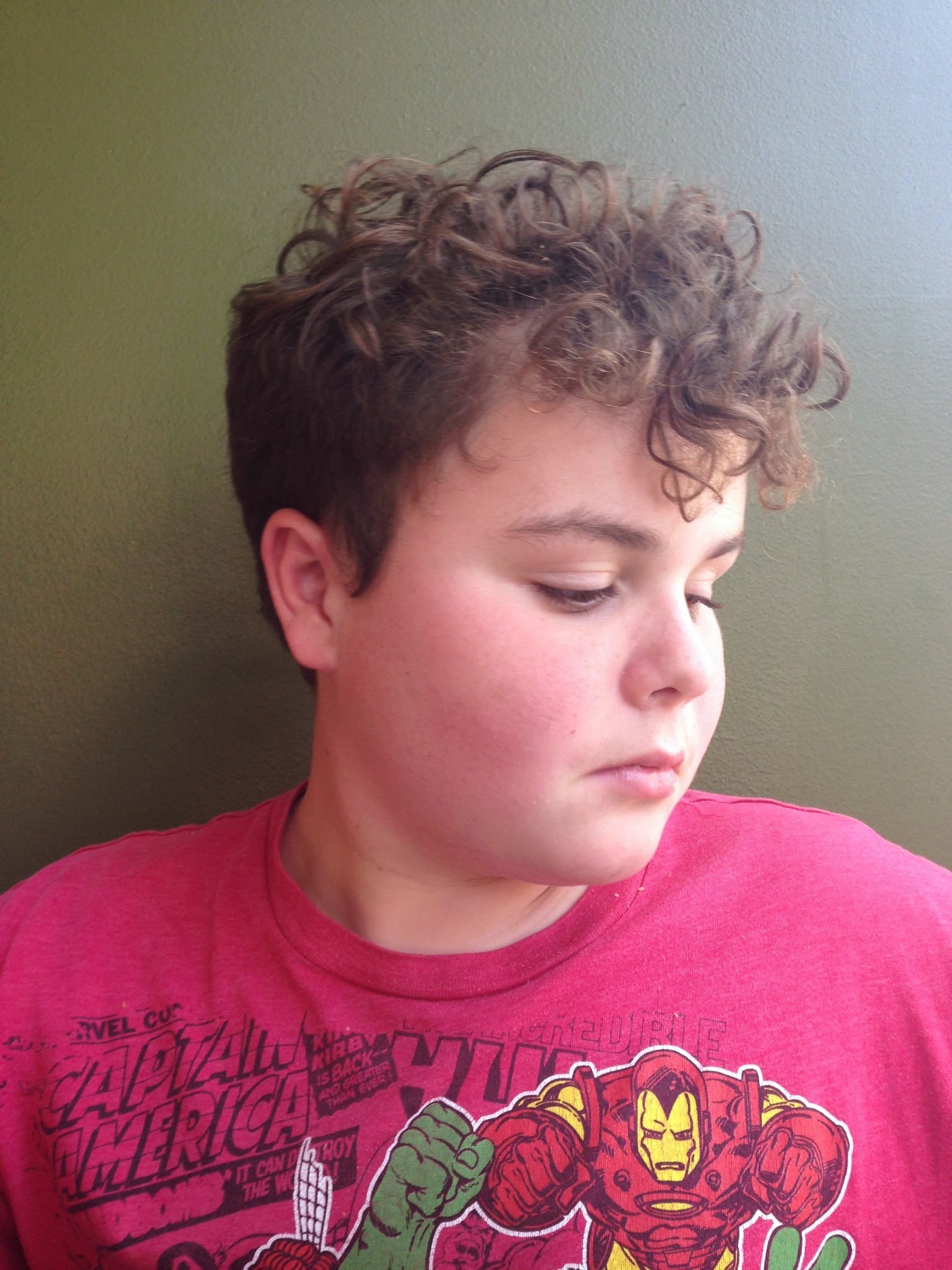 | My son Leo. Whom I adore. [Image Description: Beige-skinned teen boy with short curly brown hair, wearing a red t-shirt, in front of an olive green background, in 3/4 profile.] |