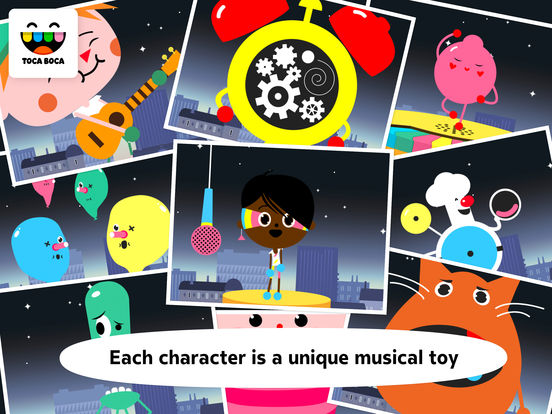 Toca Band app, overlaid with black text in a white oval, reading, “Each character is a unique musical toy.”] |
