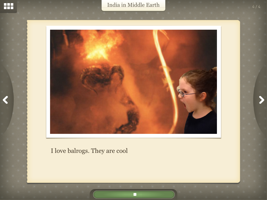 Kid in Story tale, featuring a young white girl wearing glasses, roaring at a Balrog from Lord of the Rings.] |