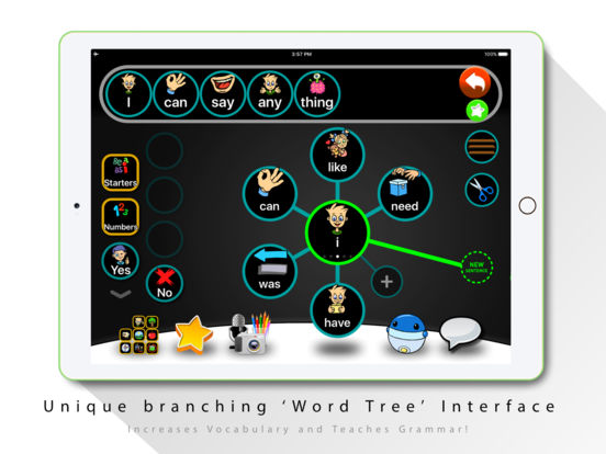 aacorn has added over 7000 core vocabulary words and aims to strengthen your child’s vocabulary knowledge by applying an innovative visual interface called the Word Tree to create word choice and branching pathways, offering predictions for the next word in a sentence. By emphasizing the relationships between words, aacorn helps reinforce essential language skills.