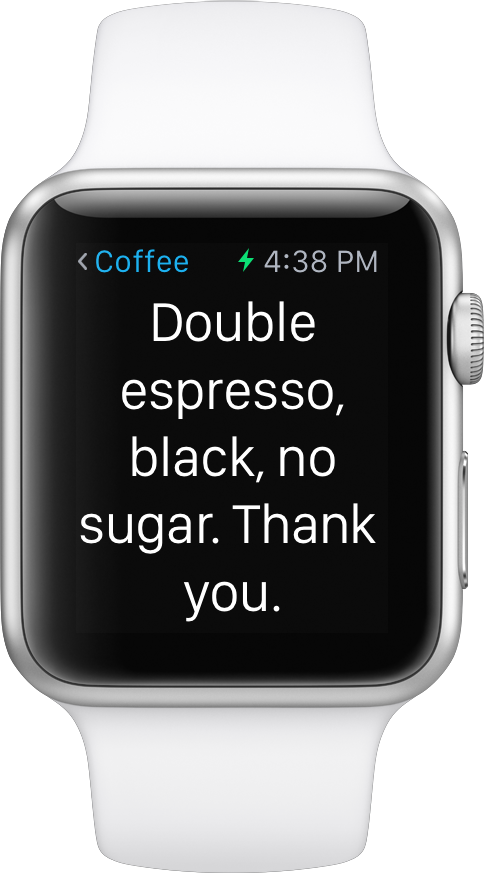 text-to-speech Apple Watch interface, reading “Double espresso, black, no sugar. Thank you.] |